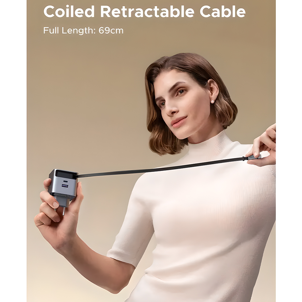 Carregador Ugreen GaN 65W Portas Usb A/C Cabo Usb C Retrátil