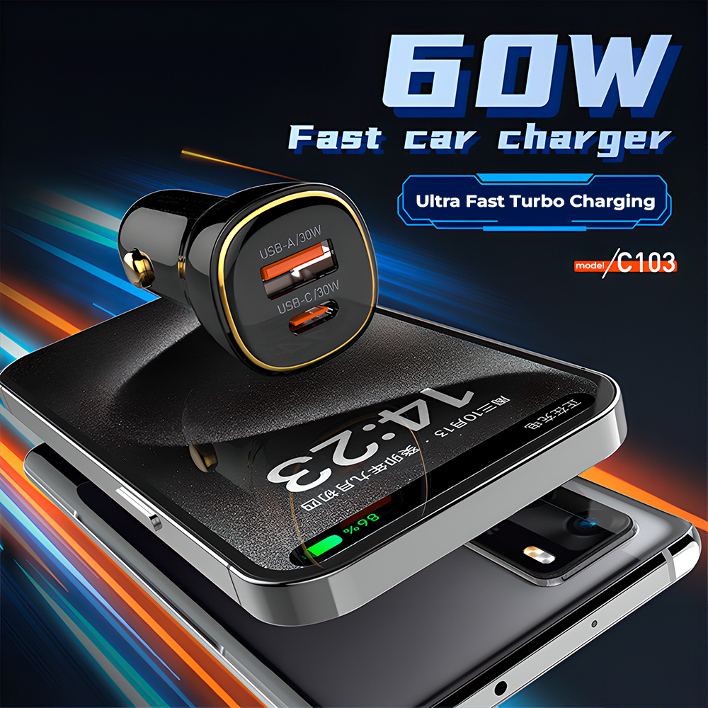 Carregador Veicular LDNIO C103 Turbo 60W USB A/C Rápido