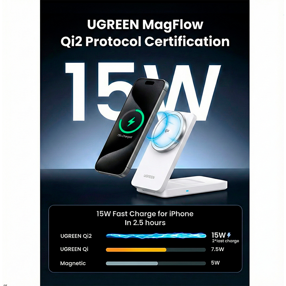 Ugreen Carregador Sem Fio Magnético 2 em 1 Qi2 20W MagSafe