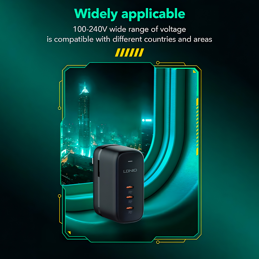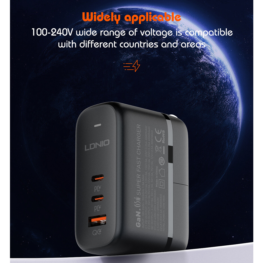 Carregador Usb C 3 em 1 LDNIO 65W GaN Carga Rápida Preto