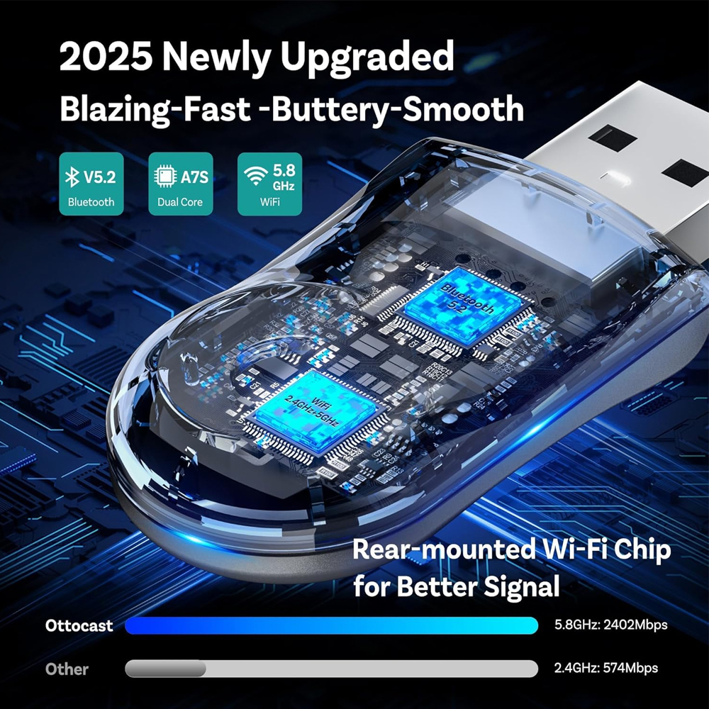 Adaptador CarPlay e Android Auto sem Fio Ottocast Mini Edge 2025, Dongle 2 em 1 com Wi-Fi 5GHz e Bluetooth 5.0, Interface Plug e Play Ultracompacta para Carros com Central Multimídia Original USB Tipo C