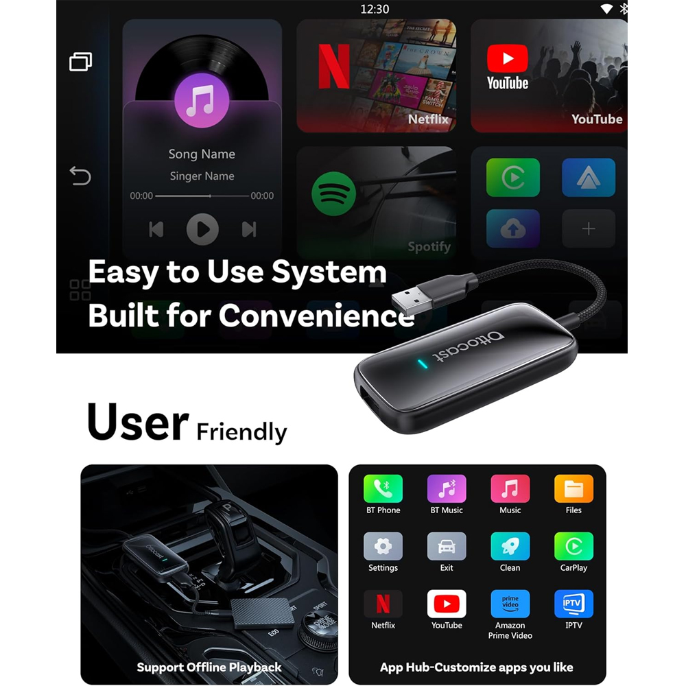3. CarPlay e Android Auto sem Fio: Elimina o uso de cabos ao converter o sistema com fio em wireless. Compatível com iPhone (iOS 10+) e Android (11+), permite alternar entre modo de streaming e interfaces inteligentes com facilidade. Mantém os comandos originais do veículo, como volante, botões e voz, preservando segurança e praticidade.