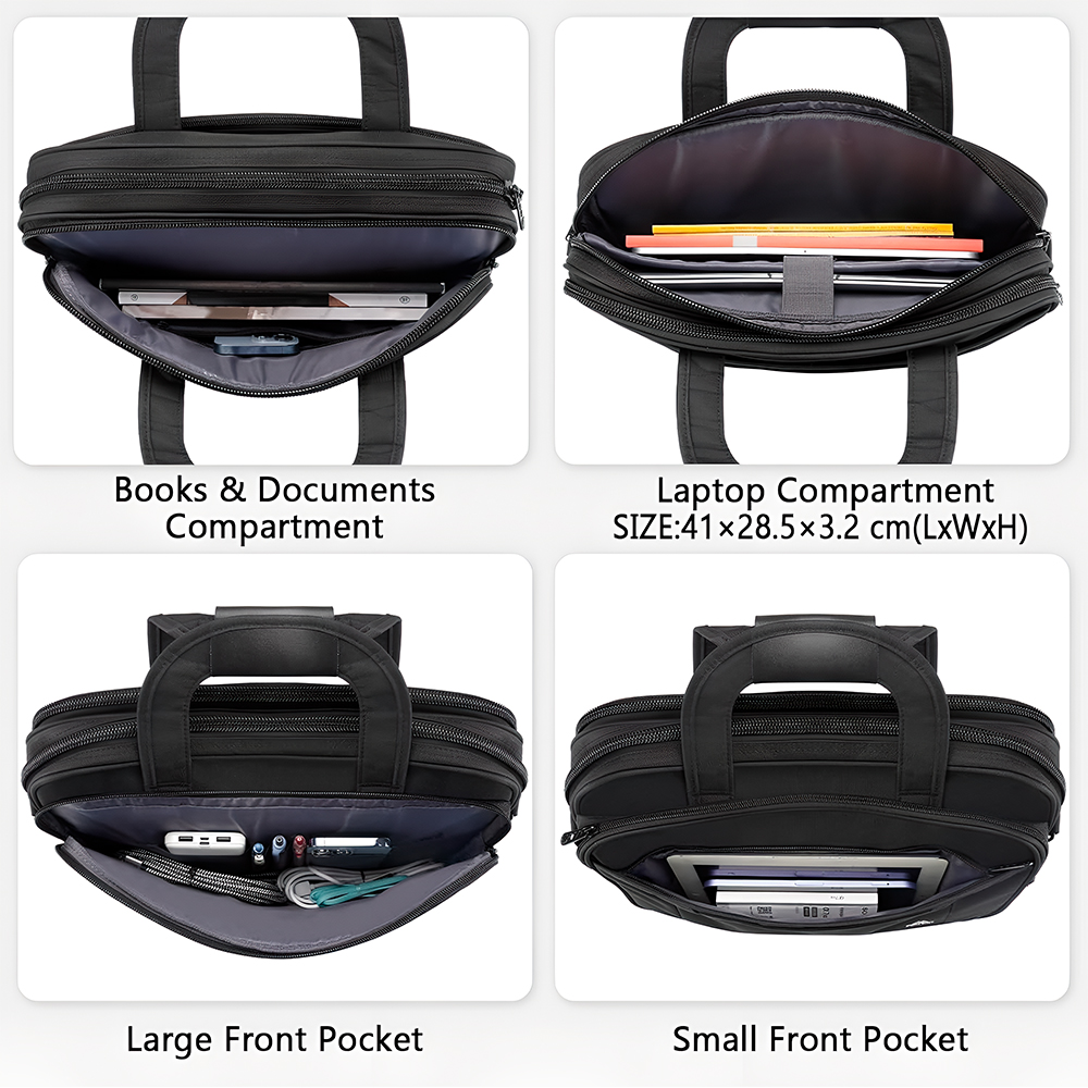 1. Estrutura Multifuncional e Grande Capacidade: A bolsa possui um compartimento principal amplo e 5 bolsos menores para organizar itens pessoais como celular, chaves e canetas. O compartimento separado acolchoado com fecho de nylon é dimensionado para laptops de até 17 polegadas.