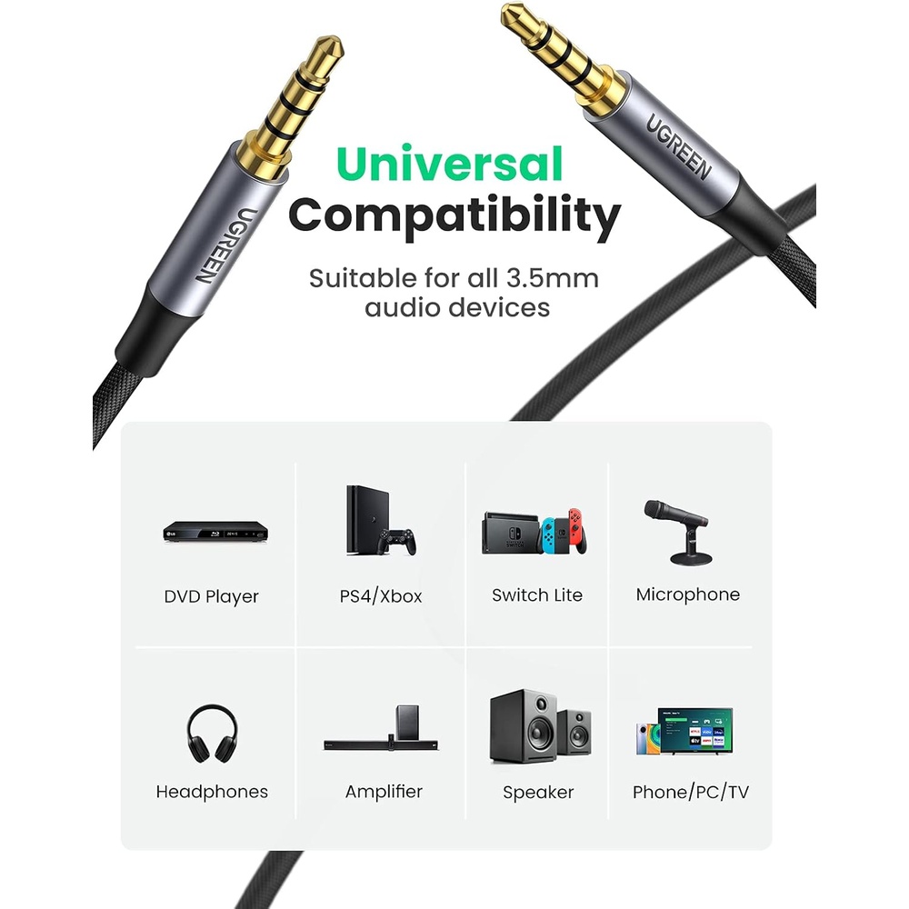 3. Ampla Compatibilidade Universal: Conecte seus dispositivos facilmente! Este cabo P2 3.5mm macho-macho Ugreen é universalmente compatível com smartphones, tablets, sistemas de som automotivo, fones de ouvido, caixas de som portáteis, notebooks e todos os aparelhos com entrada auxiliar P2.