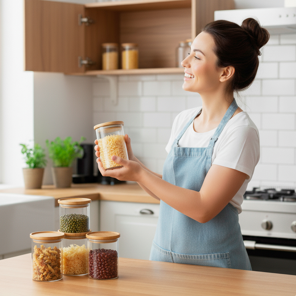 Kit 6 Potes Vidro Life Tampa Bambu Hermético Mantimentos