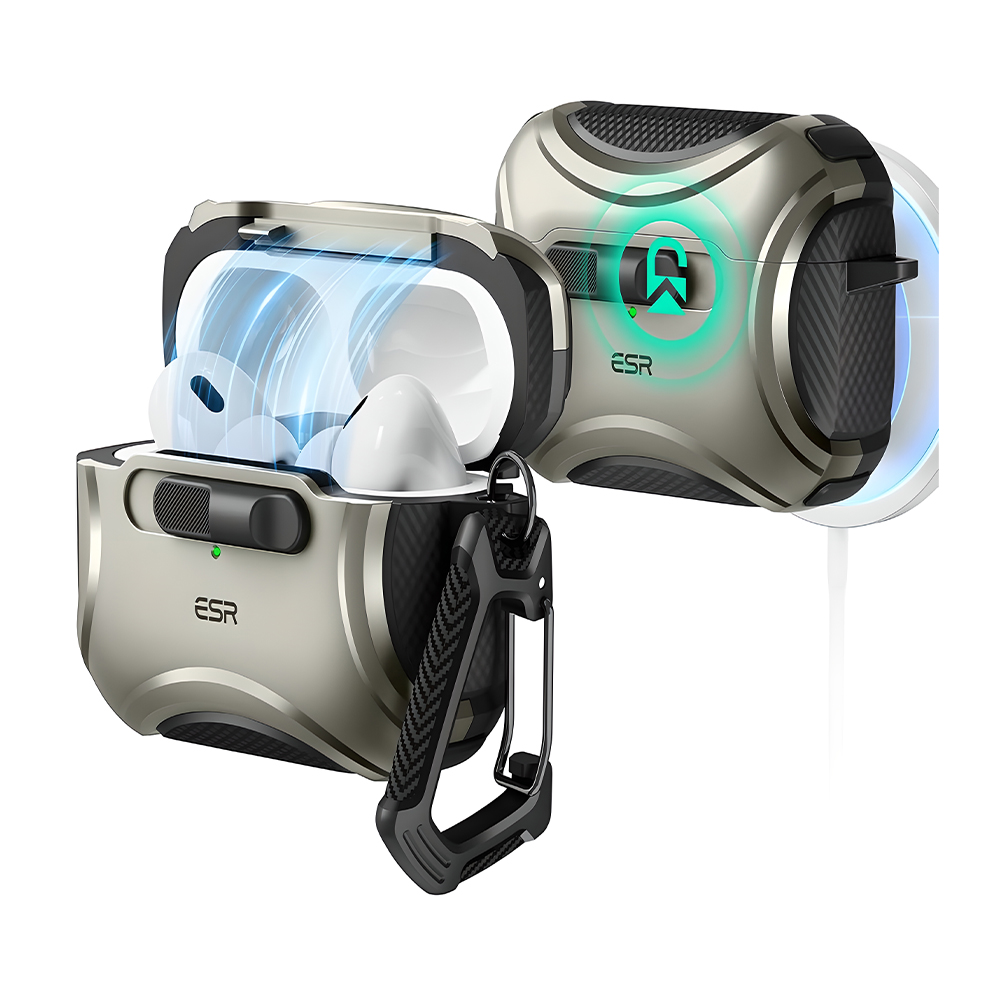 Capa ESR Cyber Series para AirPods Pro 2ª e 1ª Geração (Compatível USB-C/Lightning). Estojo Protetor com Carregamento MagSafe, Trava de Segurança Anti Queda e Abertura Fácil. Cor Titânio