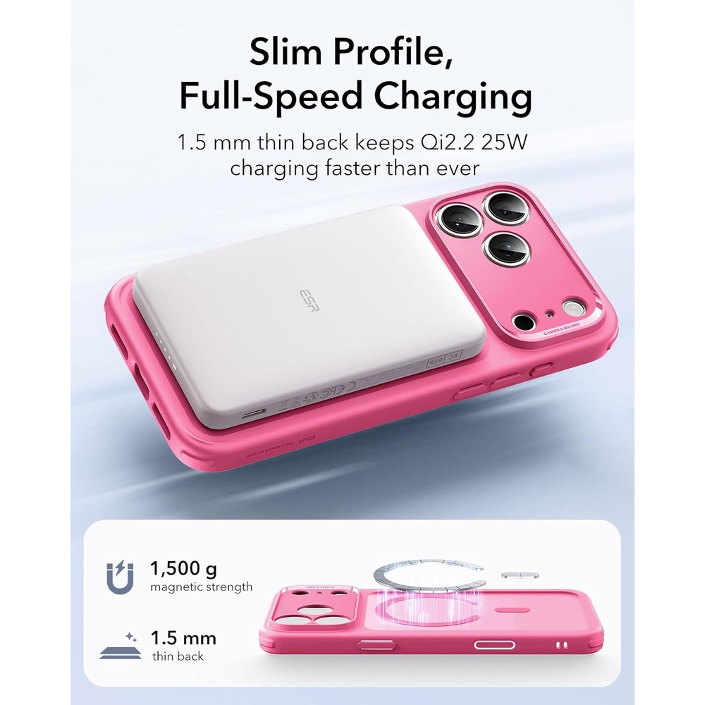 3. Design Elegante Fosco Rosa: Apresenta um acabamento em tom Rosa Fosco sofisticado, que além de adicionar um toque de estilo, proporciona uma aderência confortável e reduz marcas de digitais. A Capa ESR mantém o perfil fino do iPhone 17 Pro Max, sem adicionar volume desnecessário.