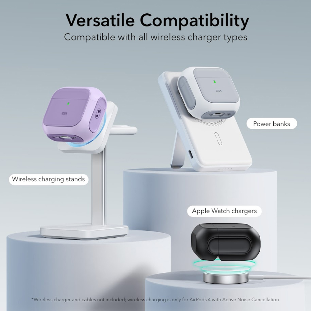 2. Conexão MagSafe com Fixação Magnética: Possui ímãs potentes integrados na parte traseira que asseguram um travamento magnético firme em carregadores MagSafe. Isso permite um carregamento sem fio prático no estilo “”toque e vá””, otimizado especificamente para o modelo AirPods 4 com Cancelamento Ativo de Ruído.