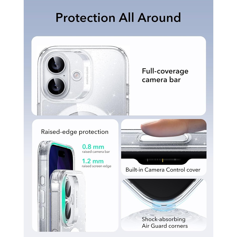 Capa Híbrida Clássica ESR para iPhone 17 Transparente/Glitter com Botão de Controle da Câmera, Proteção Contra Quedas, Laterais Flexíveis, Traseira Rígida e Compatível MagSafe