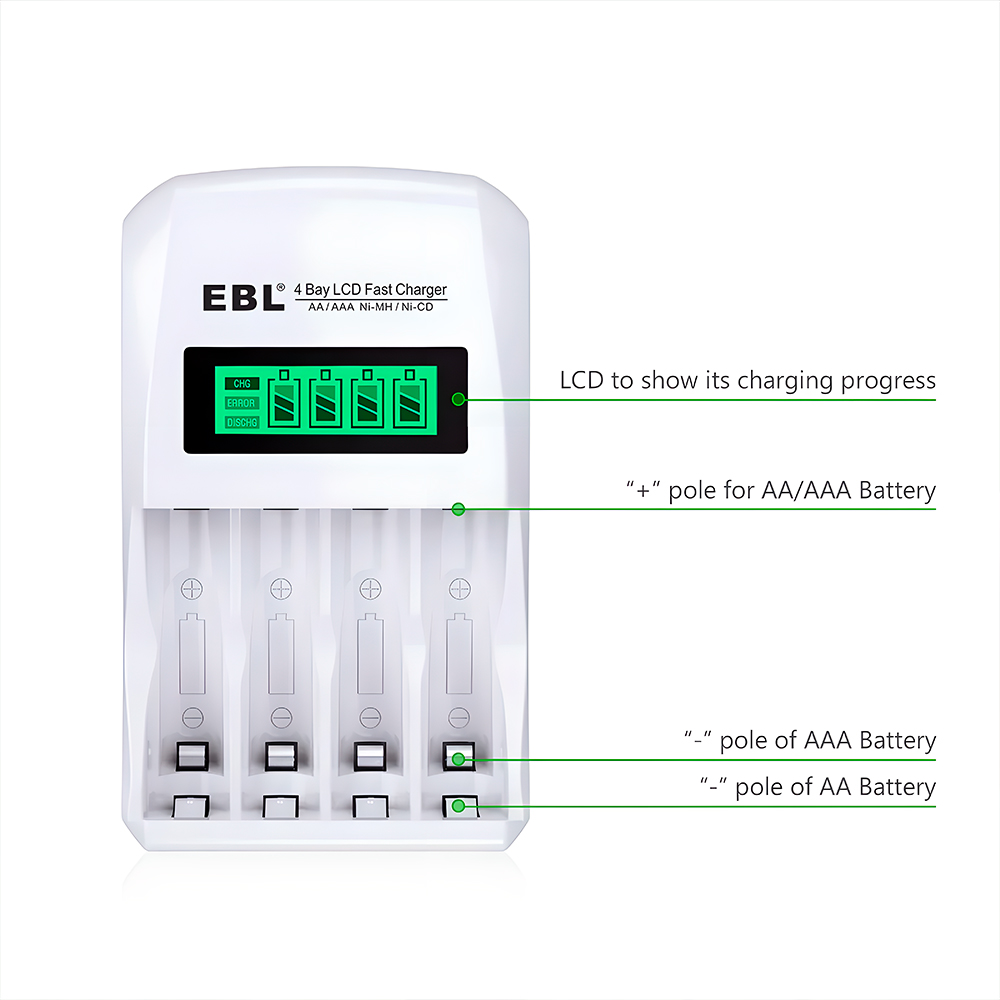 1.  Carregador de Pilhas EBL Versátil: Ideal para recarregar simultaneamente até 4 pilhas AA e AAA de 1.2V. Otimize o uso de seus dispositivos eletrônicos com este carregador eficiente e confiável da EBL para pilhas Ni-MH e Ni-CD.