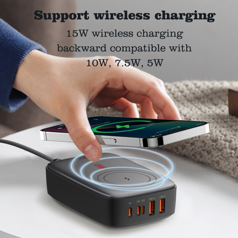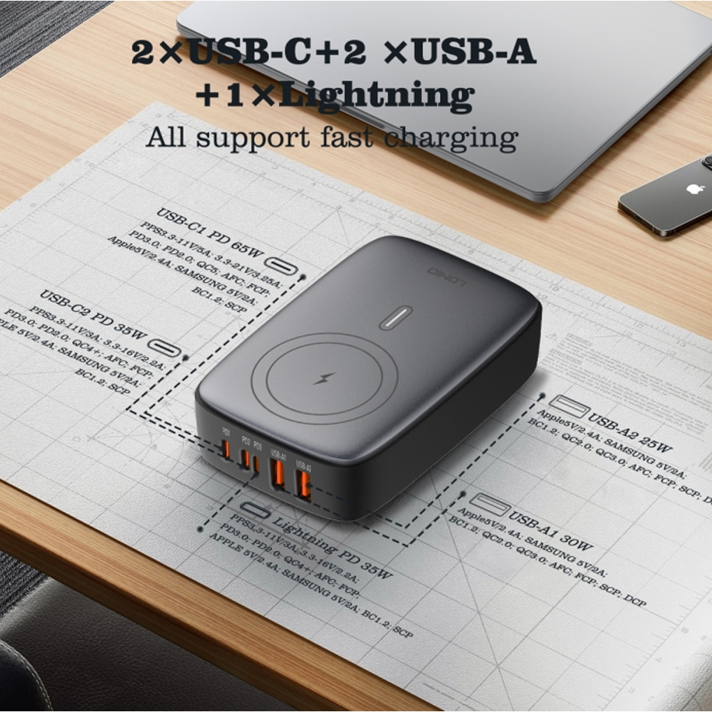 2. Estação de Carregamento 6 em 1 Desktop: Solução completa que combina 5 portas USB de alta velocidade (USB-C1 65W, USB-C2 35W, USB-A1 30W, USB-A2 25W e Porta Lightning 35W) com uma área de Carregamento Sem Fio (Wireless) de até 15W. Carregue até 6 dispositivos simultaneamente na sua mesa de trabalho ou em casa.