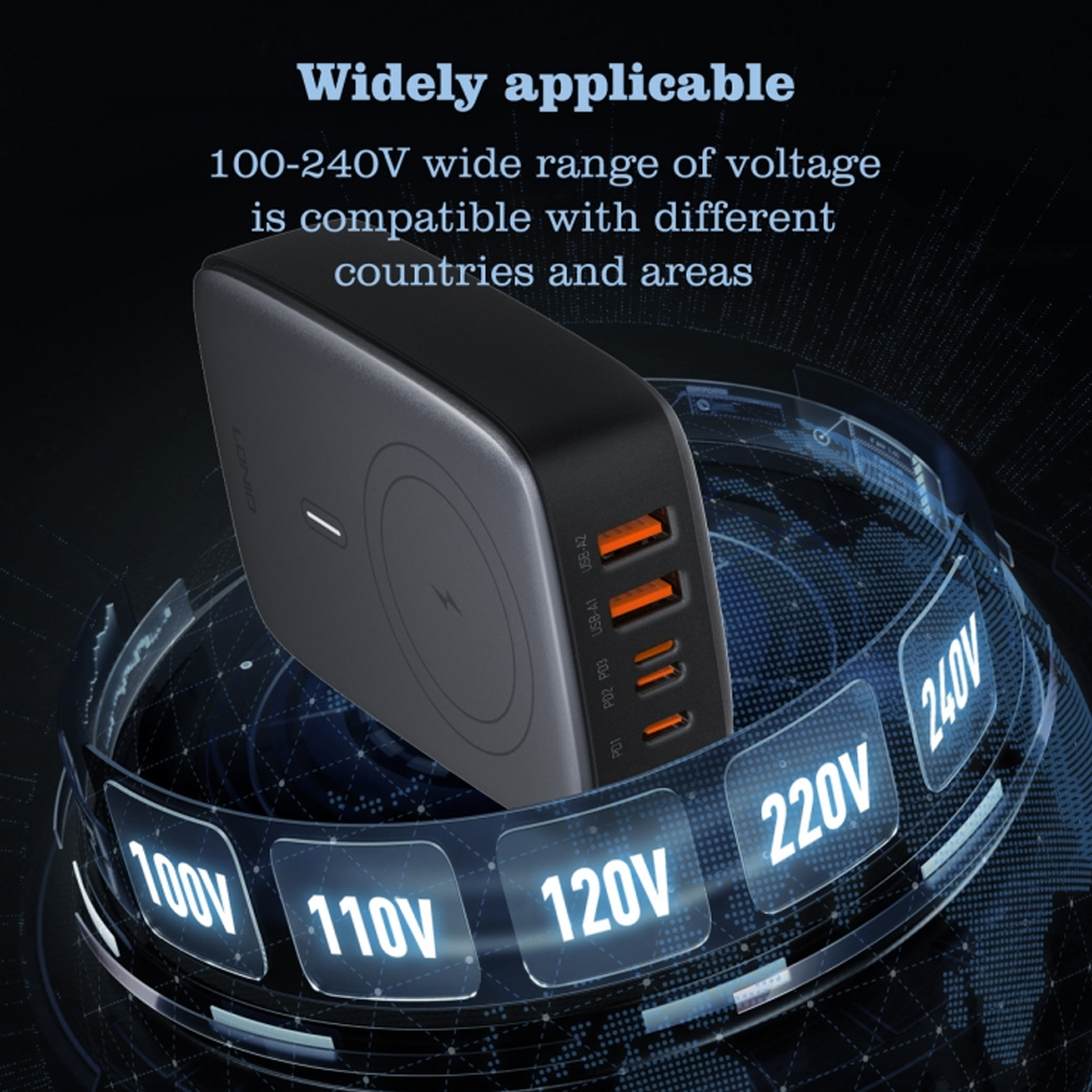 1. Potência Total de 140W com Tecnologia GaN: O Carregador de Mesa LDNIO Q4010-B utiliza a avançada Tecnologia GaN (Nitrito de Gálio) para entregar 140W de potência total. Esta inovação permite carregamento ultra rápido e eficiente em um design compacto, ideal para manter notebooks, tablets e celulares com a carga máxima.