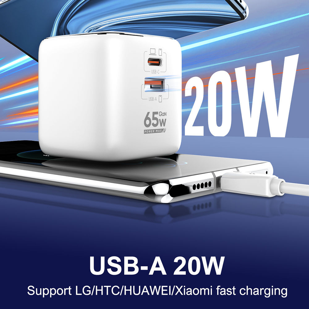 2. Duas Portas USB Versáteis (USB-A + USB-C): Possui portas duplas USB (USB-A e USB-C) com suporte para Carregamento Rápido PD (Power Delivery) e QC3.0 (Quick Charge), permitindo recarregar dois dispositivos simultaneamente em alta velocidade. A porta PD atinge a saída de 65W.