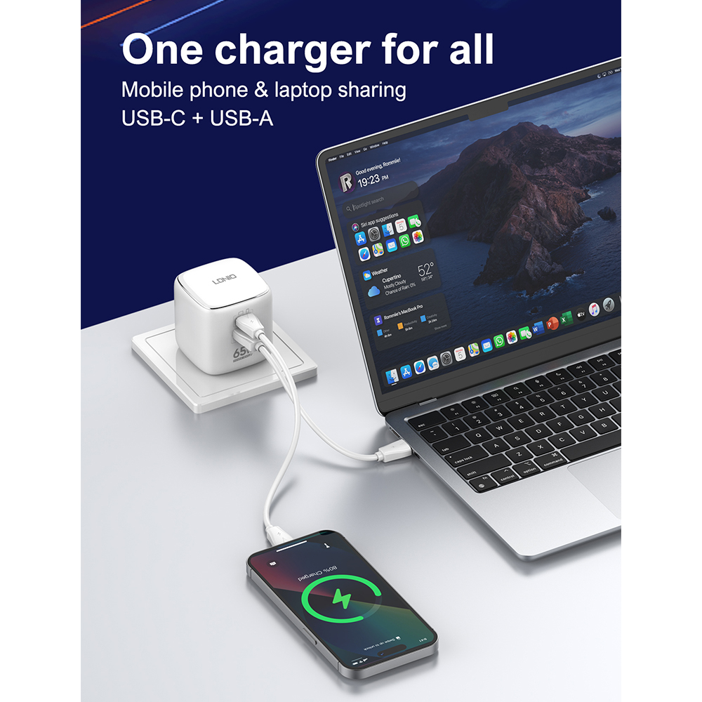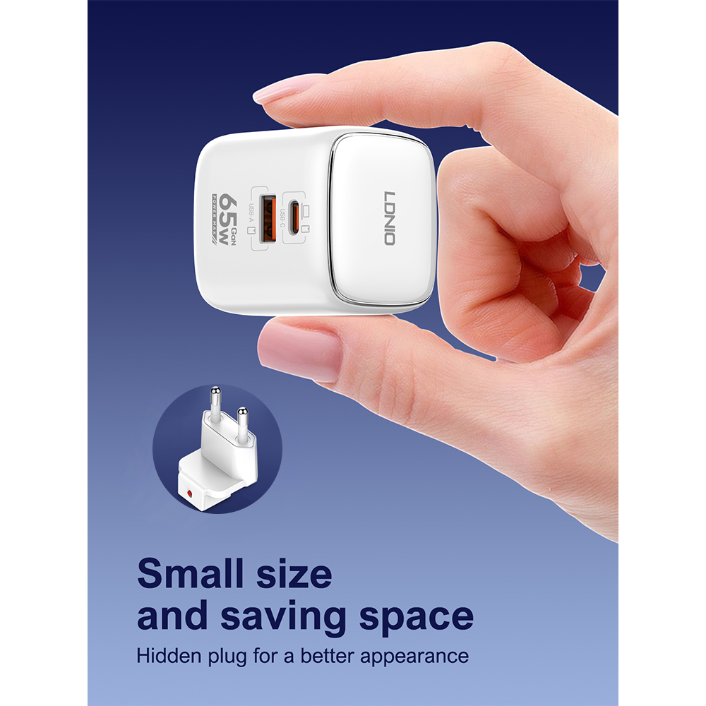 Carregador de Parede LDNIO Q2617 GaN 65W Turbo Duplo USB-A e C, Fonte Super Rápida PD QC PPS para Notebooks, Celulares e Tablets, Plugues Intercambiáveis