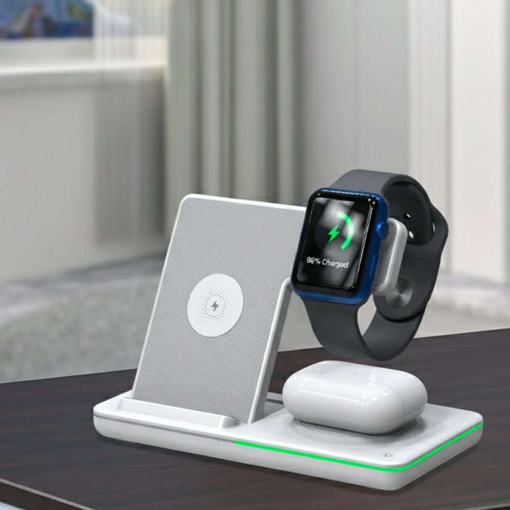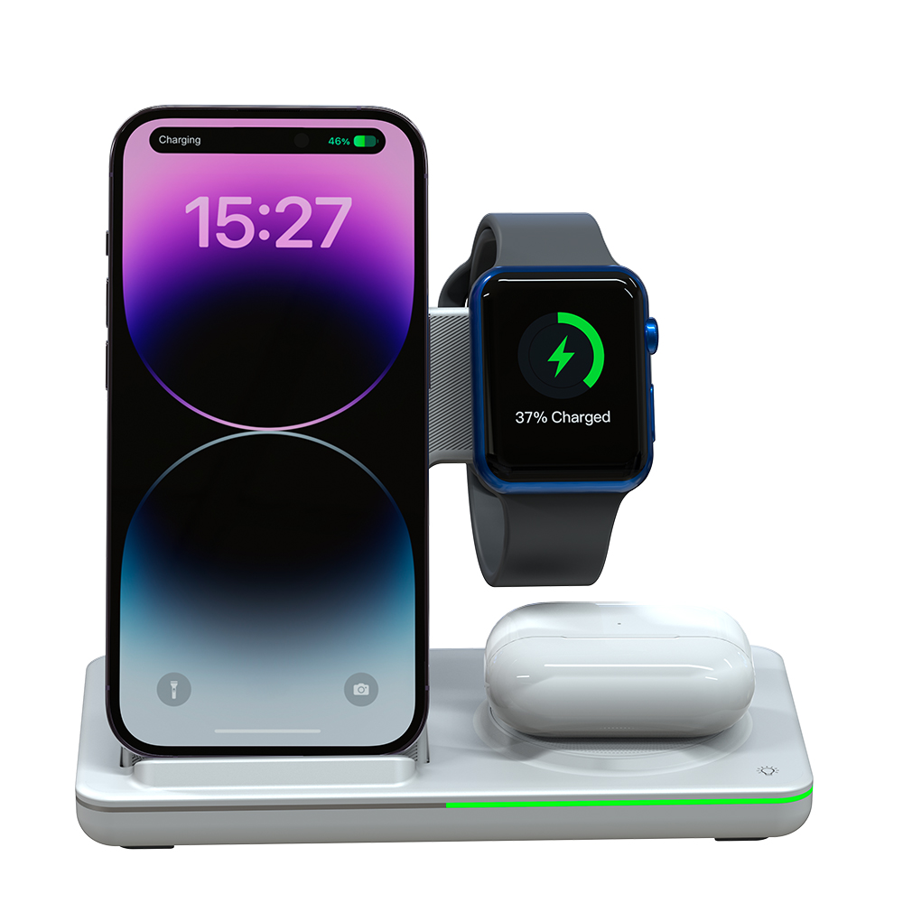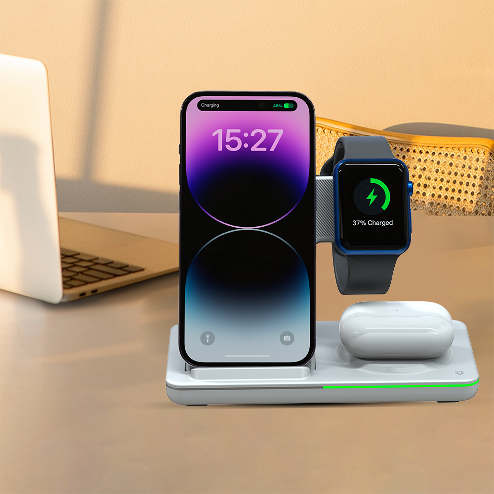 1. Carregador Magnético 3 em 1 Z27 para Dispositivos iOS: Estação de carregamento sem fio 3 em 1 projetada especificamente para o ecossistema Apple. Carregue seu Celular (Apple), Apple Watch e AirPods simultaneamente e com máxima eficiência, economizando espaço e mantendo sua área organizada.