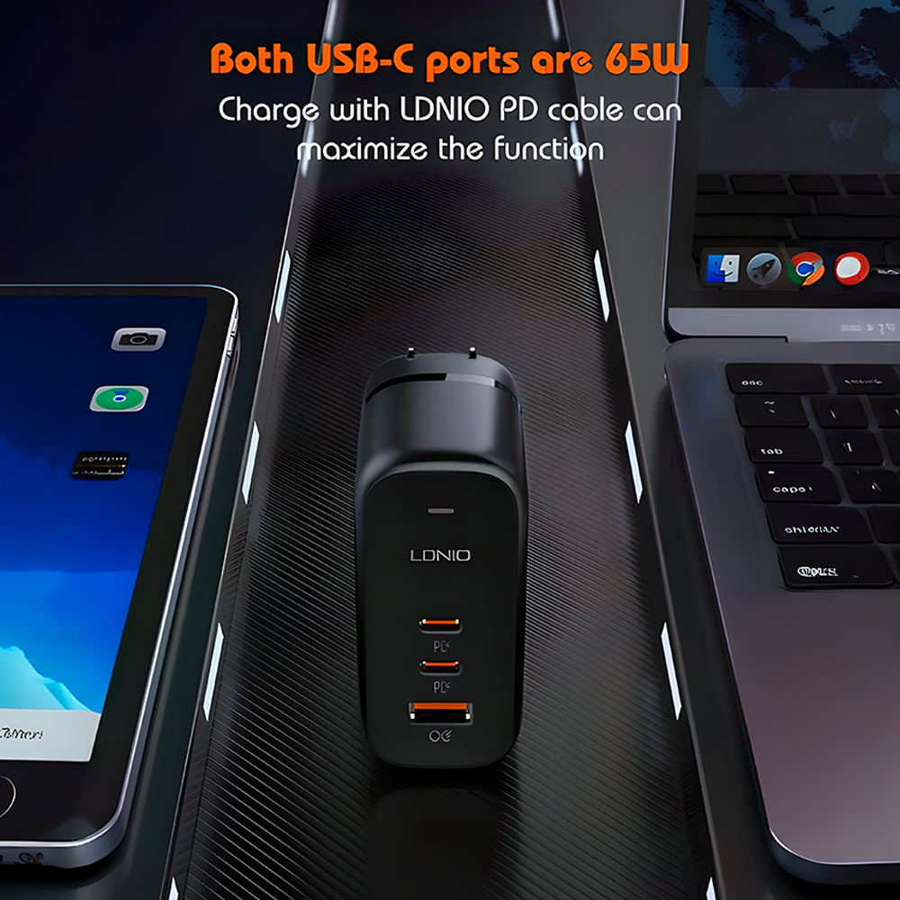 Carregador Rápido Ldnio GaN 65W 2 Usb-C/Usb-A PD QC4.0