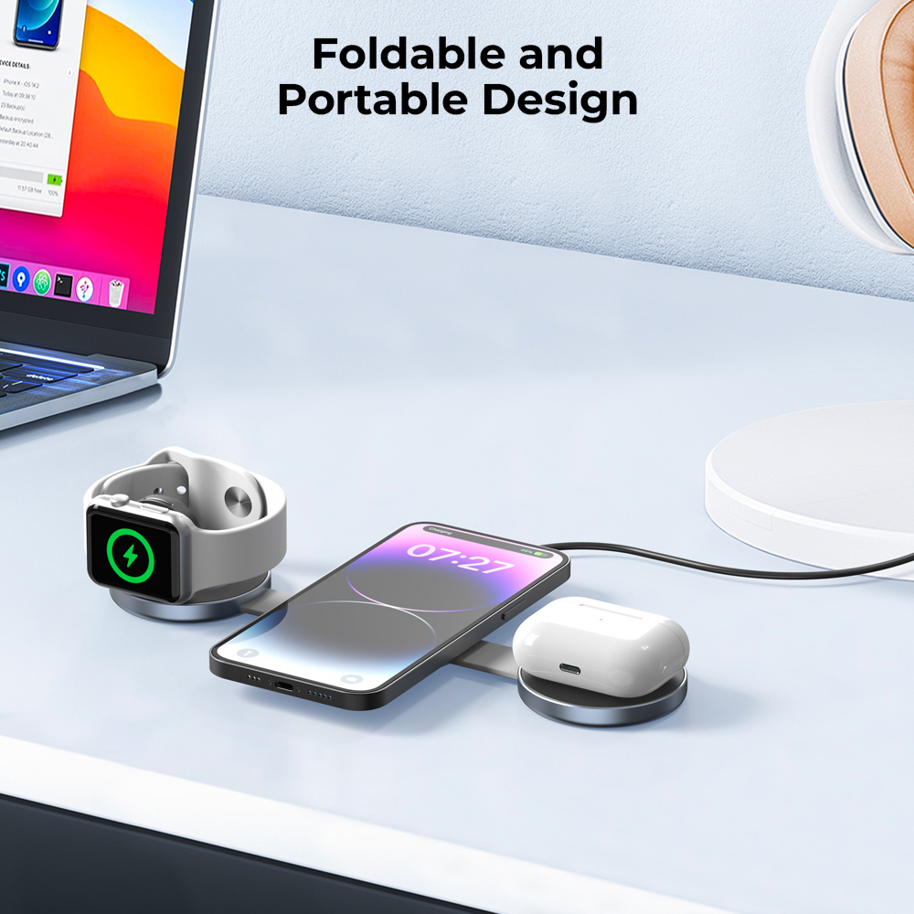 Carregador Sem Fio Life 3-em-1 Dobrável AD17 Preto, Compatível com Smartphones, Smartwatch e Fones de Ouvido, Design Compacto e Portátil