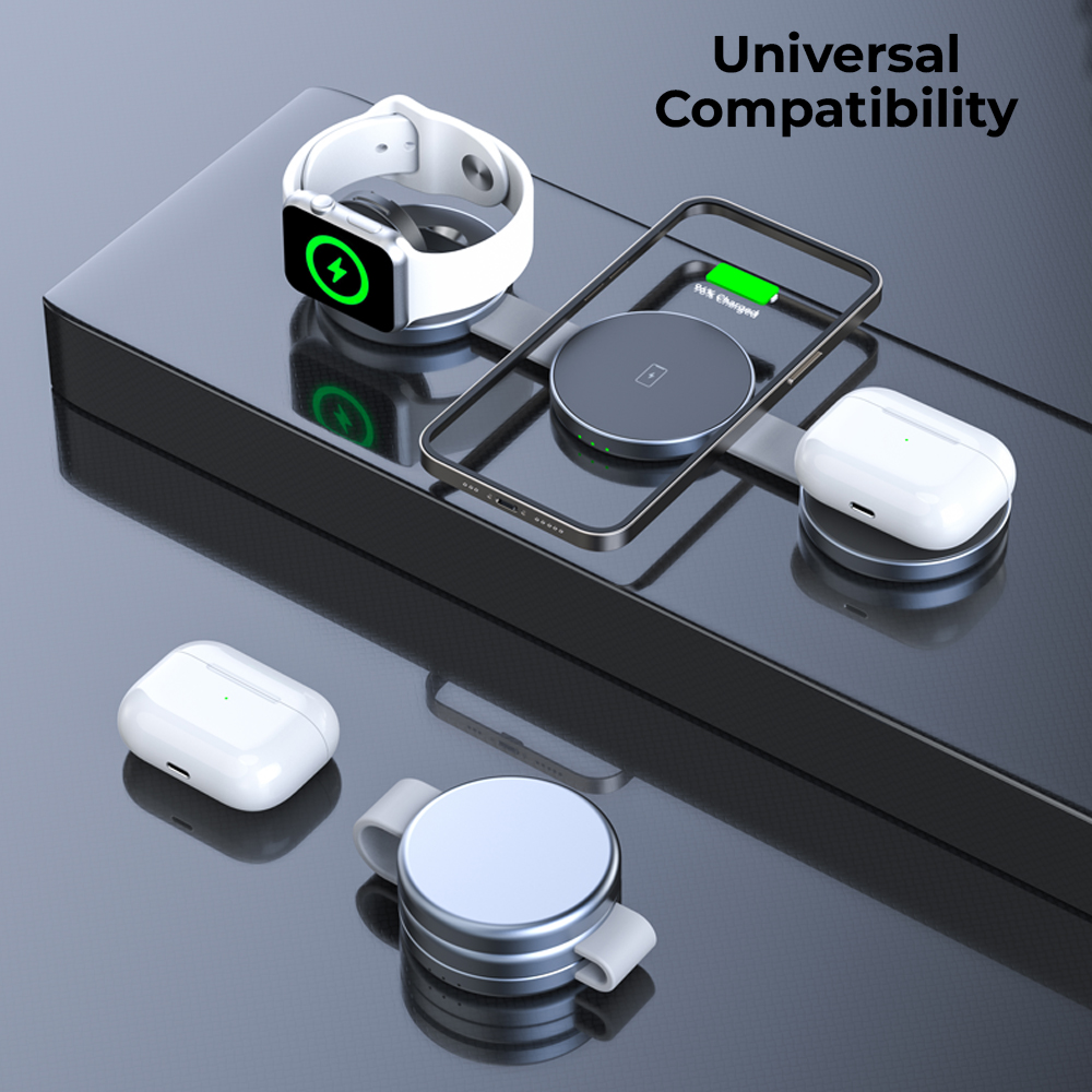 3. Compatibilidade Universal: Compatível com diversos modelos de smartphones, relógios inteligentes e fones com carregamento sem fio. Suporta múltiplas marcas, tornando o carregador versátil e confiável para toda a família.