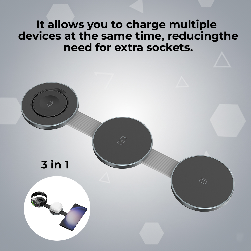 1. Carregamento 3-em-1 Super Rápido: Permite carregar simultaneamente smartphones, smartwatches e fones de ouvido sem fio. Ideal para economizar tempo, manter todos os dispositivos prontos para uso e organizar sua mesa de forma prática e eficiente.