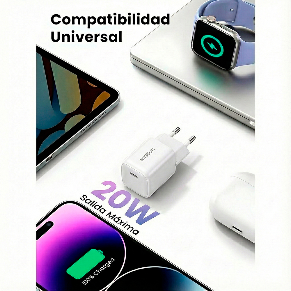 Ugreen Carregador de Parede Rápido 20W USB-C com Tecnologia GaN e Power Delivery PD, Adaptador Mini Compacto para Carregamento Veloz de Celulares e Tablets, Padrão Europeu, Branco