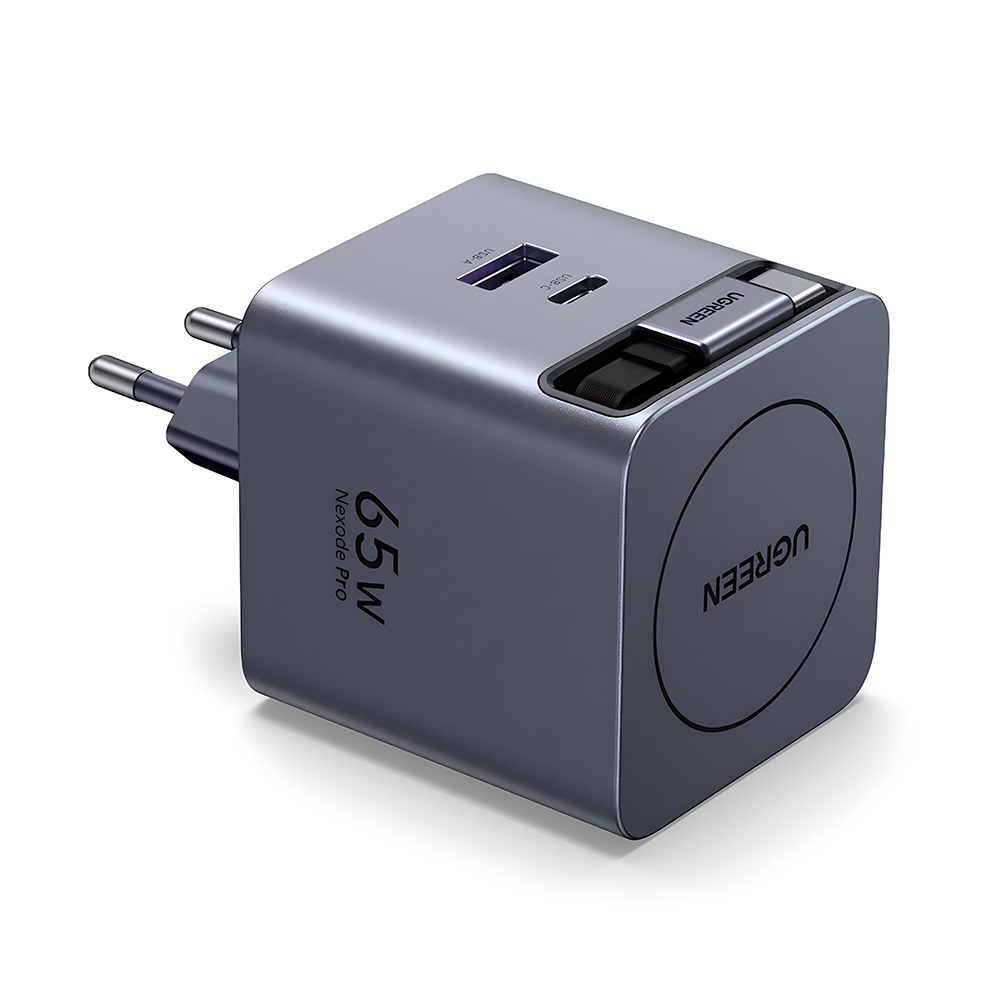Ugreen Carregador Rápido 65W GaN com Cabo Retrátil USB-C para Notebook e Celular. Fonte de Parede Carga Veloz Portátil, Tecnologia GaN, Design Compacto 65825