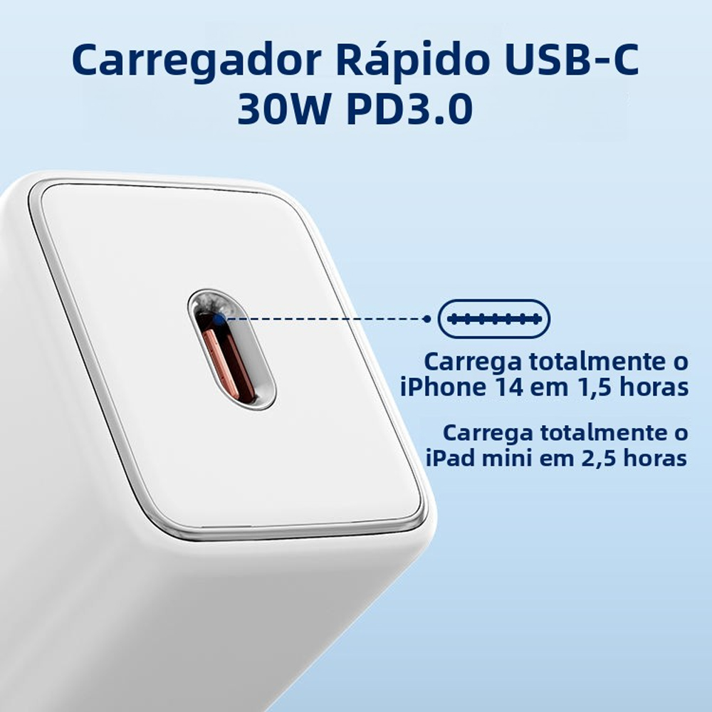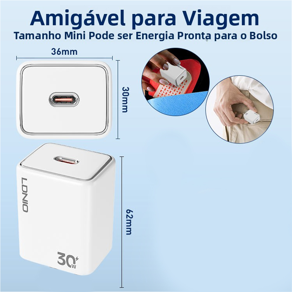 2. Alta Potência para Notebooks e Celulares: Com 30W de alta potência, esta fonte é ideal para o carregamento rápido de smartphones e também é totalmente compatível com o protocolo PD necessário para recarregar diversos modelos de notebooks e laptops.
