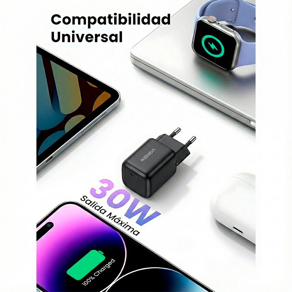 Carregador USB-C Ugreen 30W GaN PD QC4 Carregamento Rápido