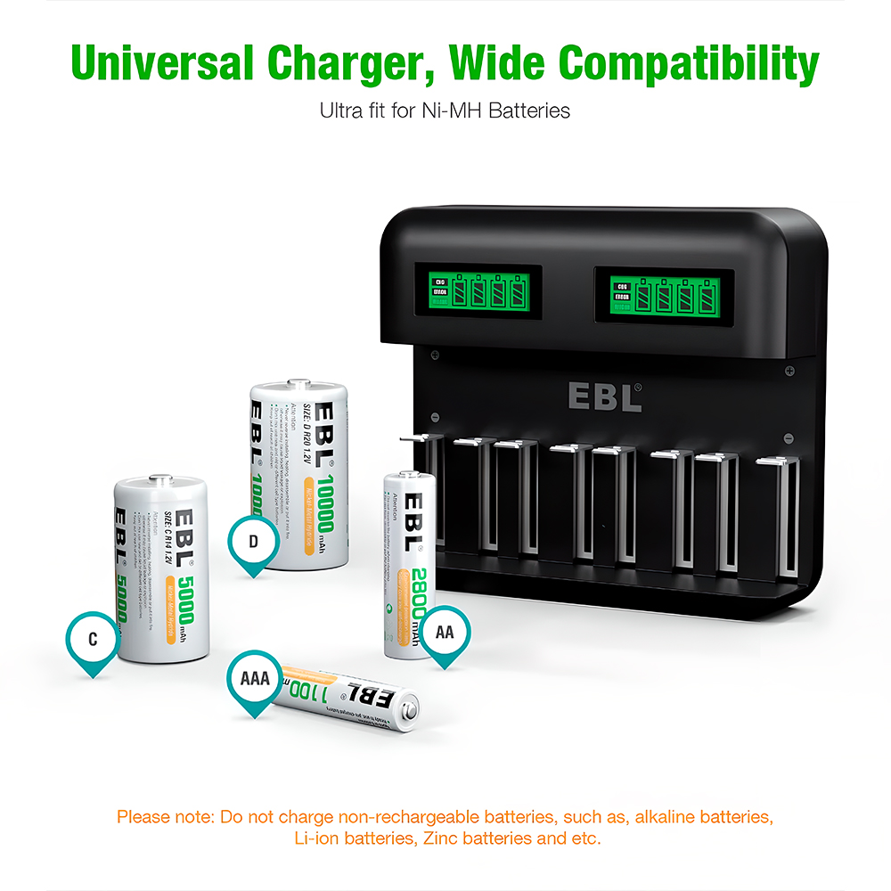 1. Carregador EBL USB Multifunção 8 Slots: Recarregue até 8 pilhas simultaneamente nos tamanhos D, C, AA e AAA. Perfeito para manter todos os seus dispositivos eletrônicos sempre prontos para uso com este versátil carregador de pilhas.