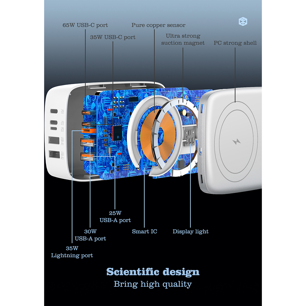 2. Estação de Carregamento 6 em 1 Desktop: Solução completa que combina 5 portas USB de alta velocidade (USB-C1 65W, USB-C2 35W, USB-A1 30W, USB-A2 25W e Porta Lightning 35W) com uma área de Carregamento Sem Fio (Wireless) de até 15W. Carregue até 6 dispositivos simultaneamente na sua mesa de trabalho ou em casa.