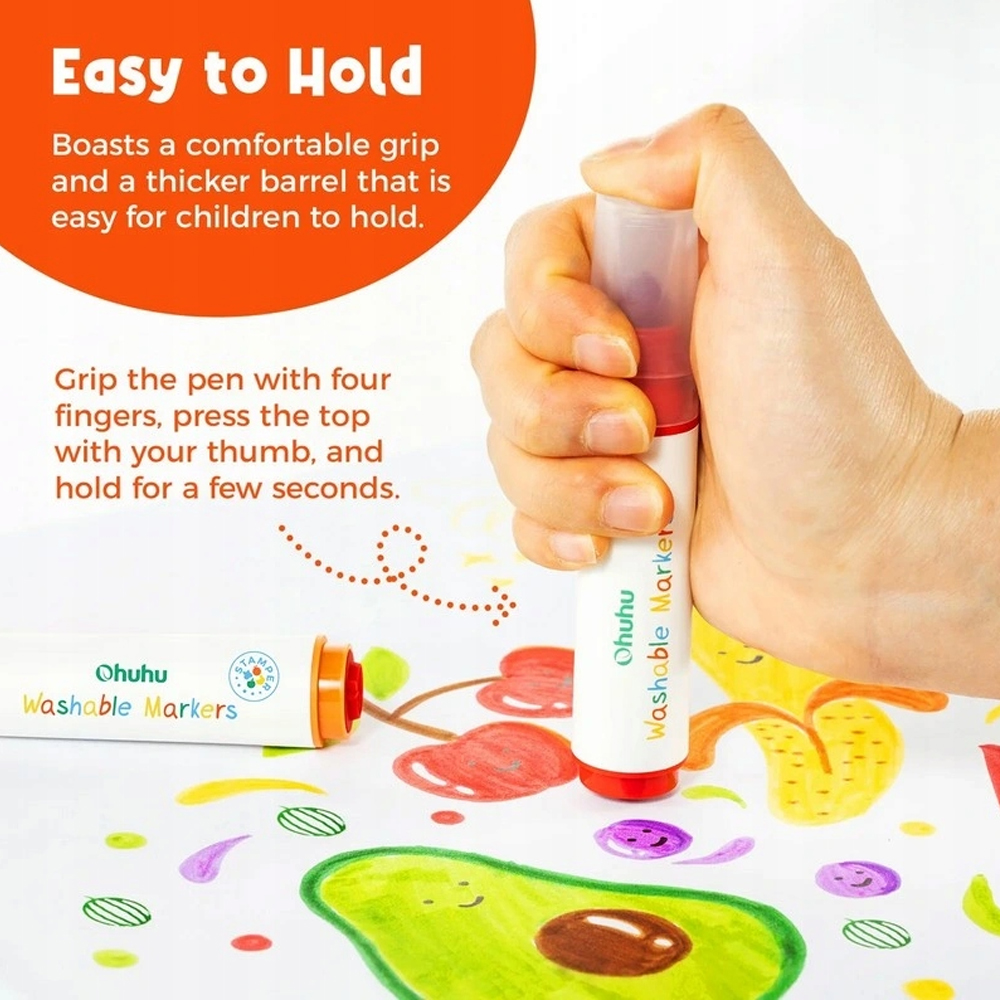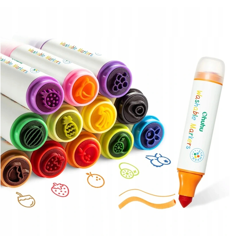 Conjunto de 12 Marcadores Laváveis Ohuhu à Base de Água com Carimbos de Frutas Ponta Cônica e Estojo Portátil Canetinhas Coloridas Atóxicas para Desenho e Atividades Criativas Diversas