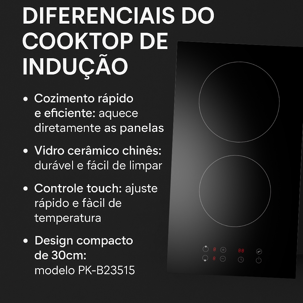 Cooktop Fogão Elétrico Indução Life 2 Bocas 30cm Preto, Vidro Cerâmico Chinês, Controle Touch, 220-240V, Ideal para Cozinhas Compactas, Modelo PK-B23515