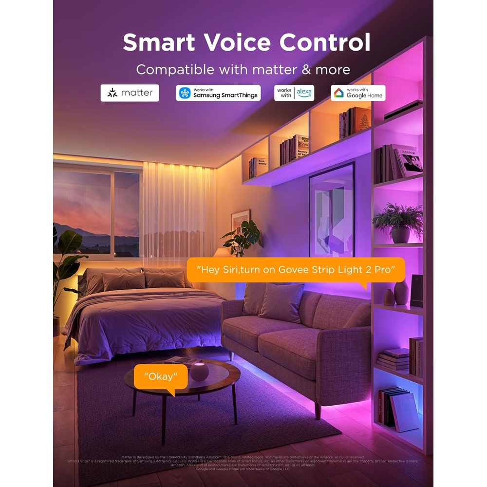 3. Conectividade Inteligente: Integre sua Fita LED Govee ao seu ecossistema Smart Home com compatibilidade Matter, um padrão de conectividade unificado. Controle a iluminação de forma prática via aplicativo Govee Home (Wi-Fi), por voz através de assistentes inteligentes compatíveis ou com comandos de cena pré-definidos.