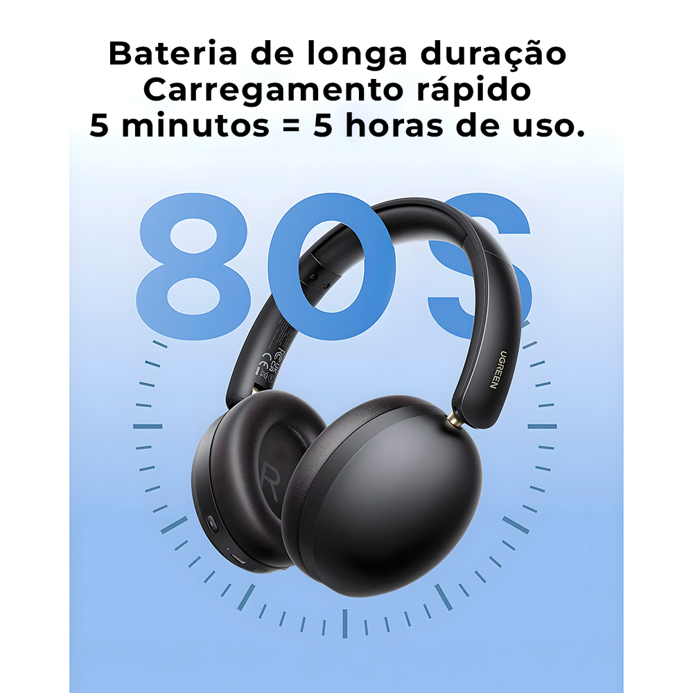 O Ugreen HiTune Max2 possui bateria de alta capacidade que oferece até 80 horas de reprodução. A função de carga rápida permite cerca de 5 horas de uso com apenas 5 minutos de carregamento, ideal para rotinas intensas.