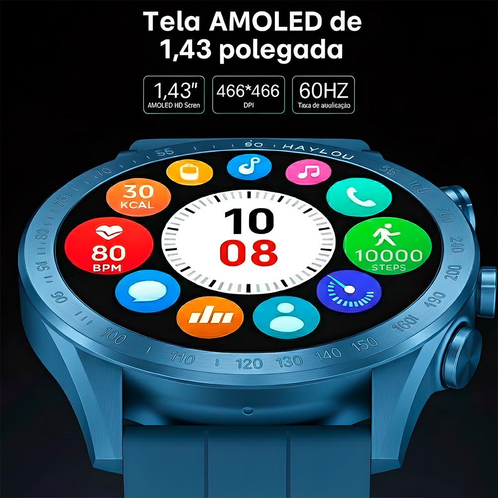 1. Haylou Solar Pro com Tela AMOLED HD e Botão Giratório: Apresenta um display AMOLED de 1.43 polegadas com alta resolução (466*466px) e Tela Sempre Ativa para visuais nítidos. O botão giratório inovador facilita a navegação fluida e intuitiva entre os menus e configurações.