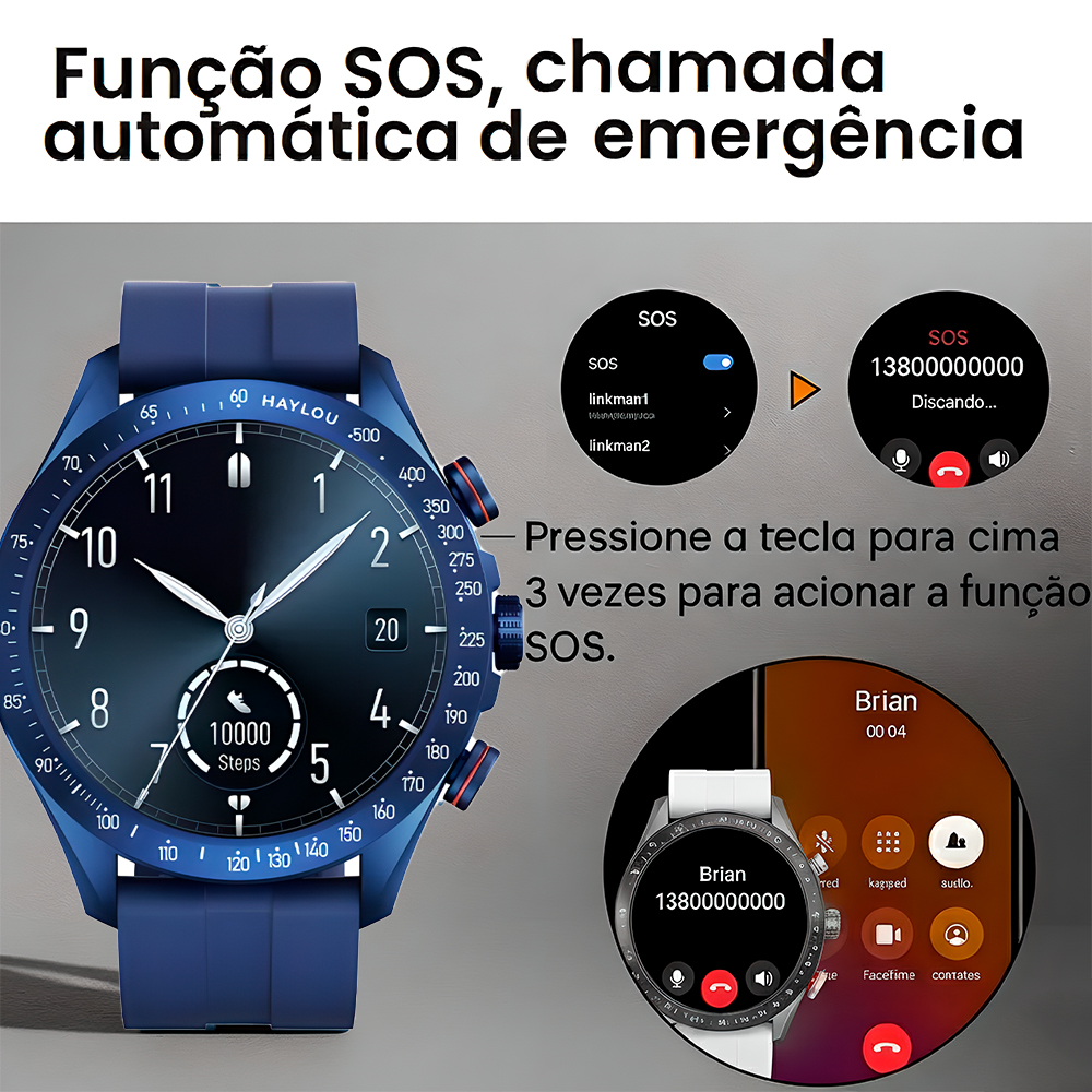 2. Chamadas Bluetooth de Alta Fidelidade e Função SOS: Equipado com chip Bluetooth 2-em-1 (Dual-more), oferece conexão estável e rápida para realizar e atender chamadas com qualidade de som Hi-Fi. Inclui a Função SOS para emergências (requer pareamento com celular).