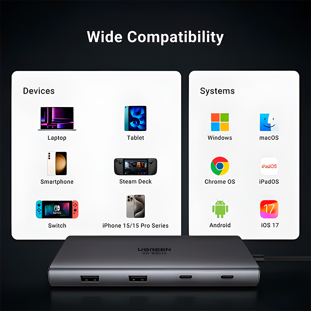 Ugreen Hub USB-C 10 em 1: Adaptador para Notebook e MacBook com Saída Dual HDMI 4K@60Hz, Carregamento PD 100W, Gigabit Ethernet, USB-C 3.2, USB-A 3.2/3.0 e Leitor SD/TF, Otimize sua Estação de Trabalho – 45380