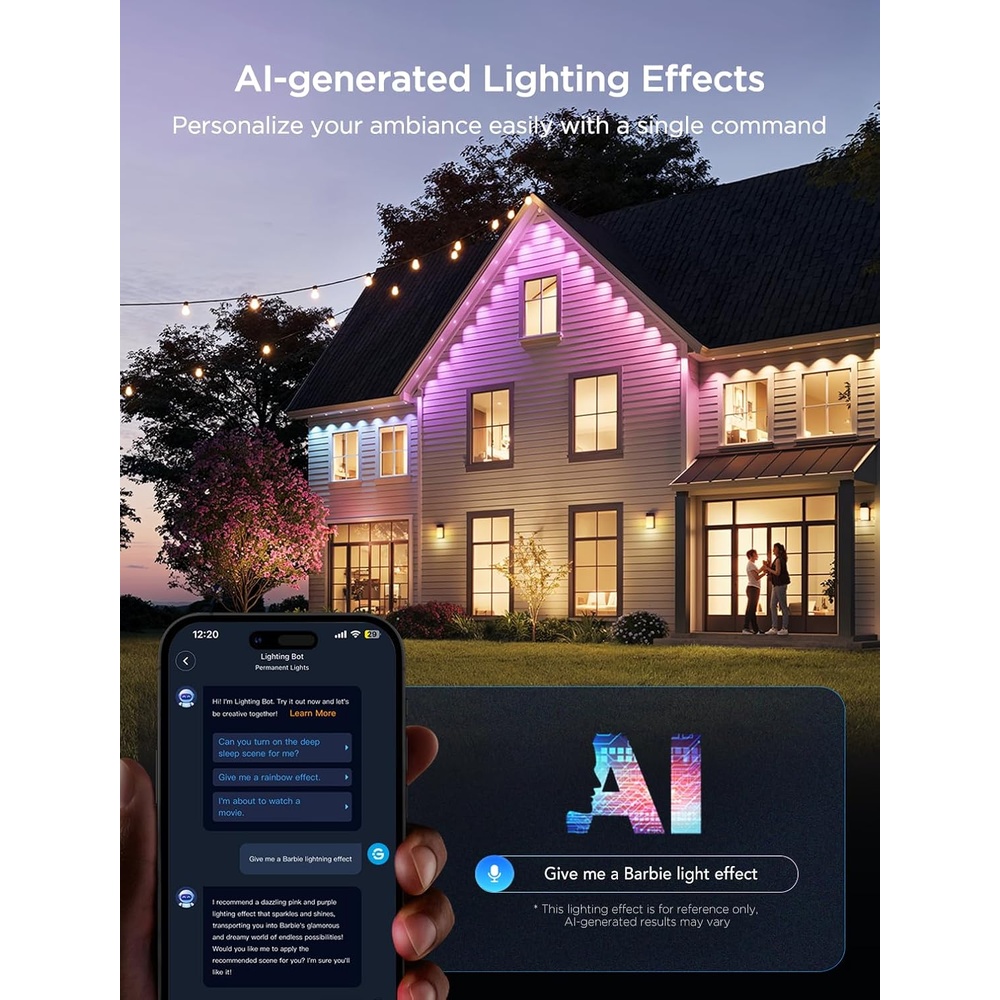2. Show de Luzes com Inteligência Artificial: Além de 100 cenas predefinidas para Natal, Halloween e eventos esportivos, este modelo conta com gerador de efeitos via IA. Através de comandos simples, a inteligência artificial cria atmosferas personalizadas para cada ocasião, transformando o exterior da sua residência com um toque de exclusividade.