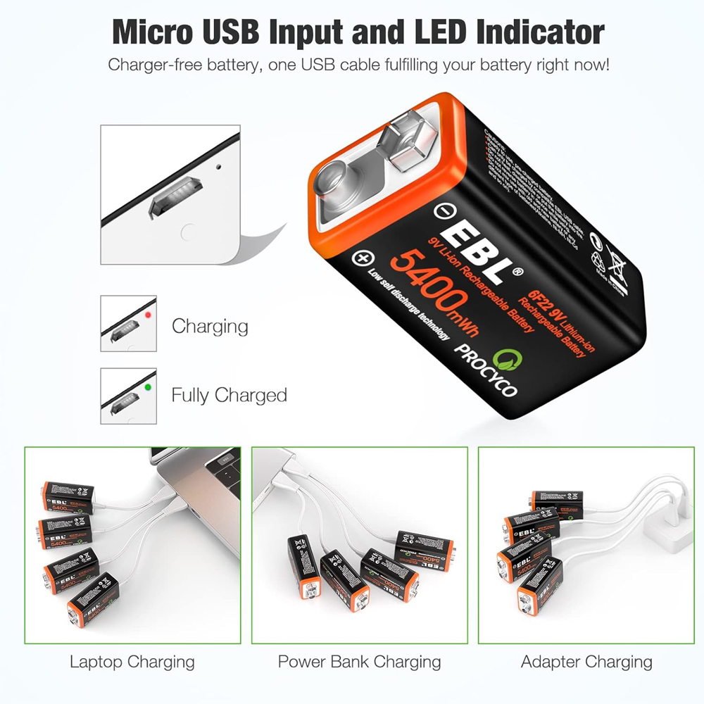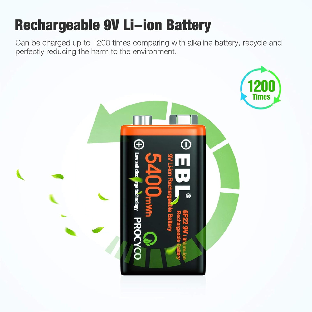 1. Baterias de 9 V de longa duração: a bateria de íons de lítio de 9 V de alta capacidade da EBL fornece 5400 mWh de energia para uso diário prolongado. Com densidade de energia superior e mais de 1600 ciclos de carga, ela supera as baterias descartáveis.