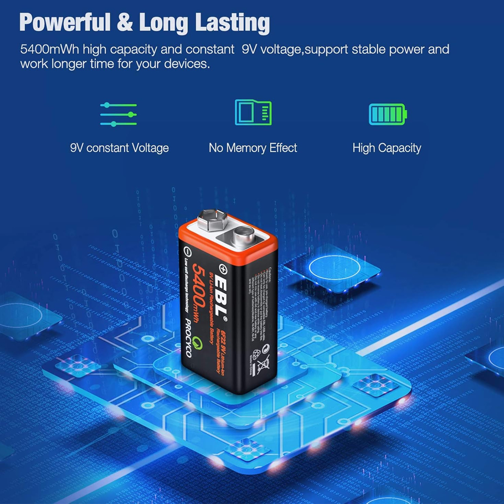 3. Mais de 1600 recargas: a bateria de lítio EBL de 9 V com tecnologia PROCYCO atualizada garante mais de 1600 ciclos — livre-se de baterias descartáveis e reduza o desperdício, economizando custos a longo prazo.