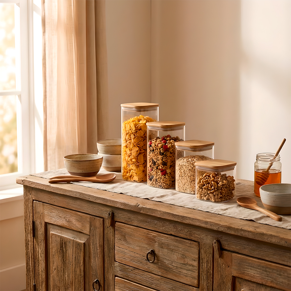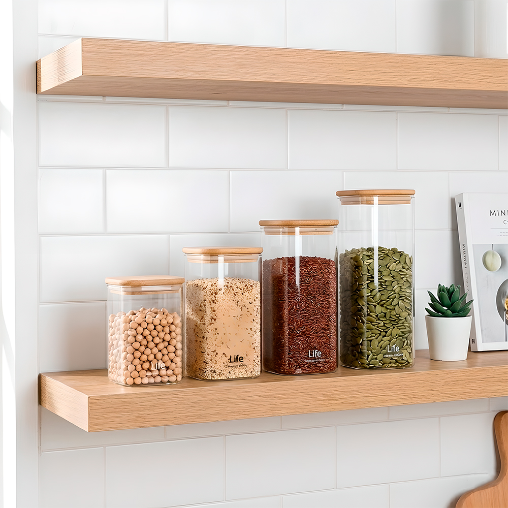 Pote de Vidro Hermético Quadrado com Tampa de Bambu e Vedação de Silicone Life – Kit 4 Peças para Mantimentos e Organização – Capacidades 600ml, 1.3L, 1.7L, 2.2L