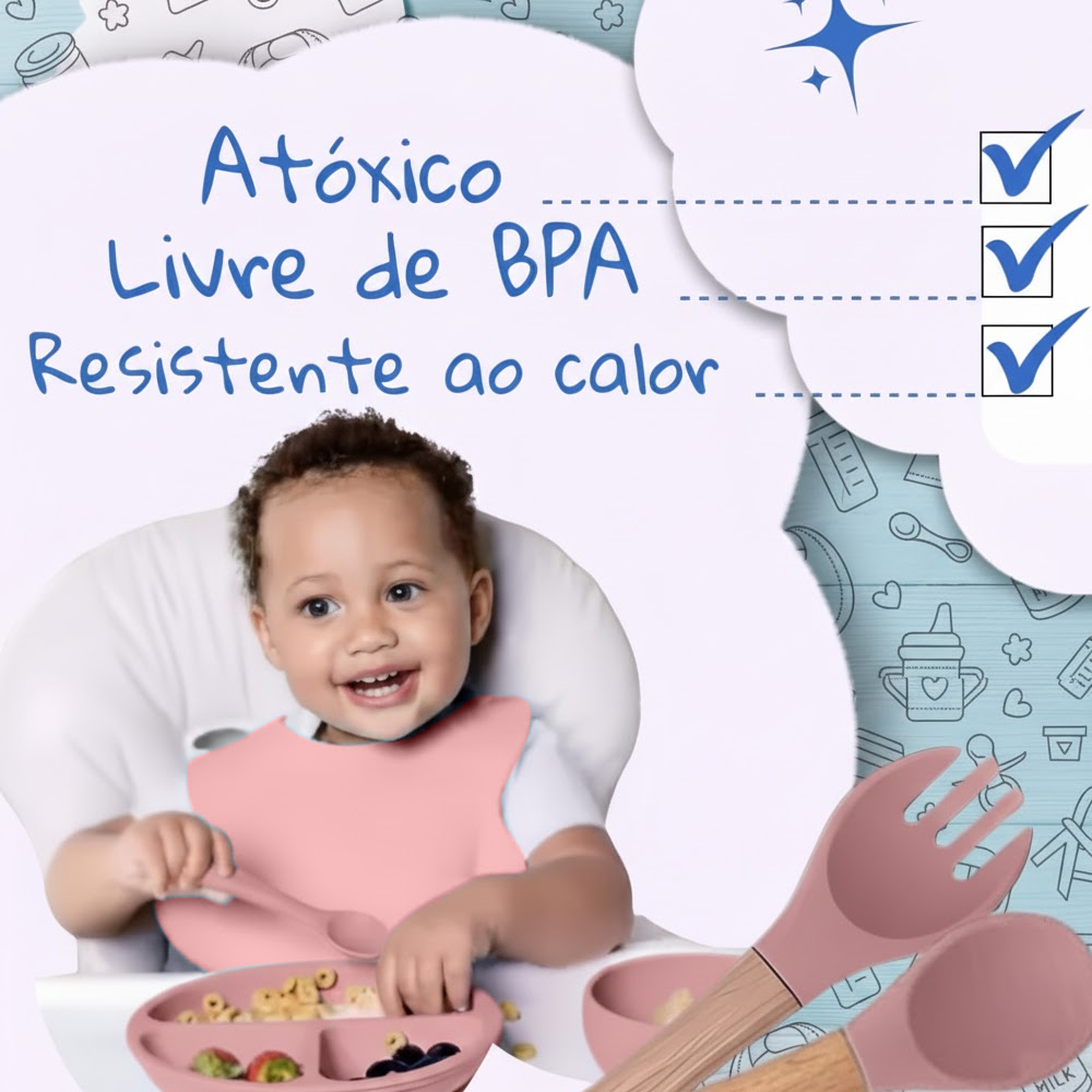 2. Materiais Seguros e Duráveis: Fabricado com silicone de alta qualidade, livre de BPA, este conjunto é seguro para o bebê e fácil de limpar. O cabo de madeira dos talheres garante durabilidade, proporcionando conforto e segurança durante o uso diário.