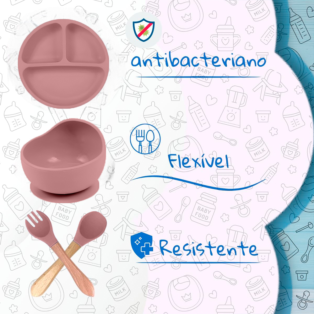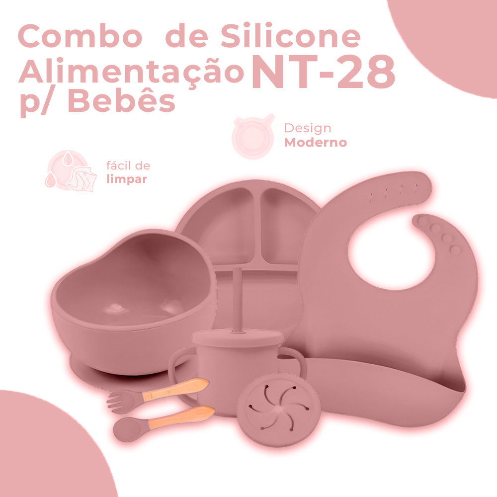 Combo Silicone Alimentação Infantil Rosa Life NT-28 – Conjunto com Prato, Tigela, Caneca, Talheres de Silicone, Babador para Bebê – Seguro, Livre de BPA e Prático de Limpar