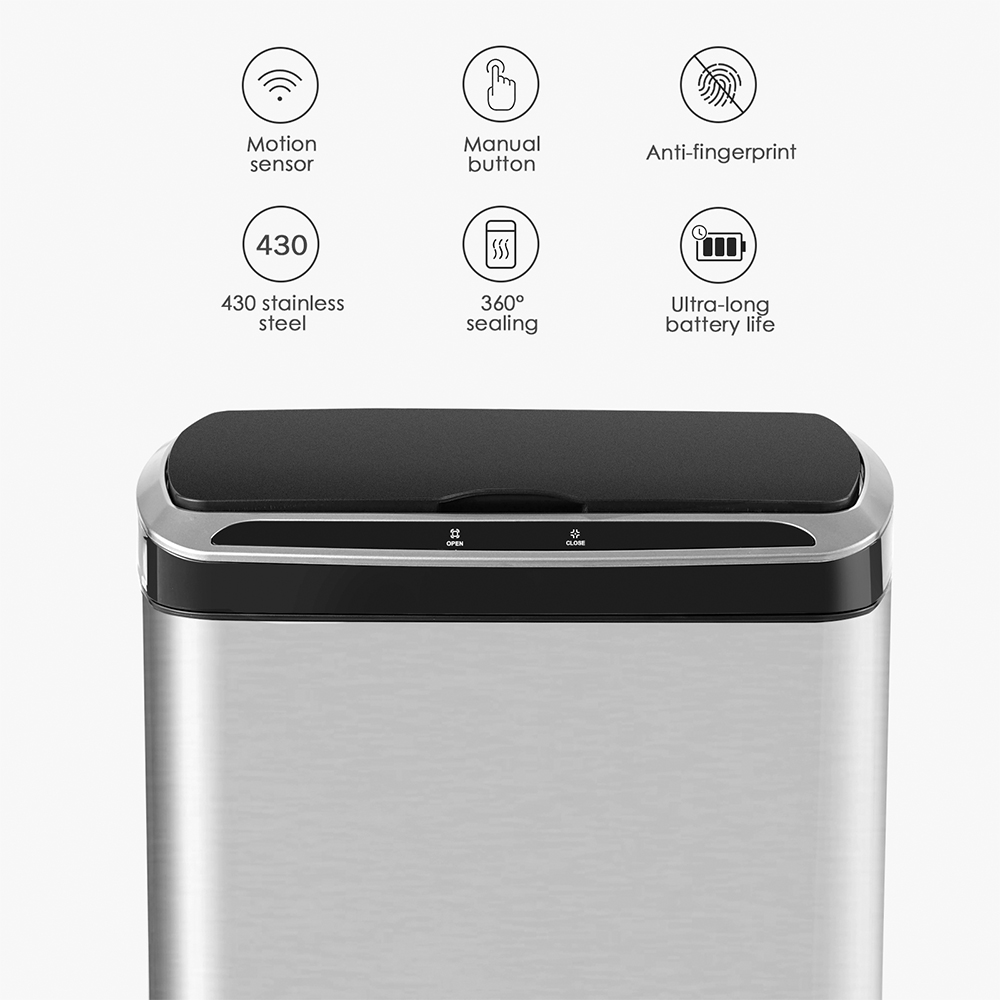 3. Tecnologia Anti-Digitais e Construção Robusta: A superfície em aço inoxidável é tratada para ser à prova de impressões digitais, mantendo sua lixeira com aspecto limpo e brilhante por mais tempo, reduzindo a necessidade de limpeza constante. Sua construção reforçada (heavy-duty) garante durabilidade e resistência ao uso diário, prolongando a vida útil do produto.