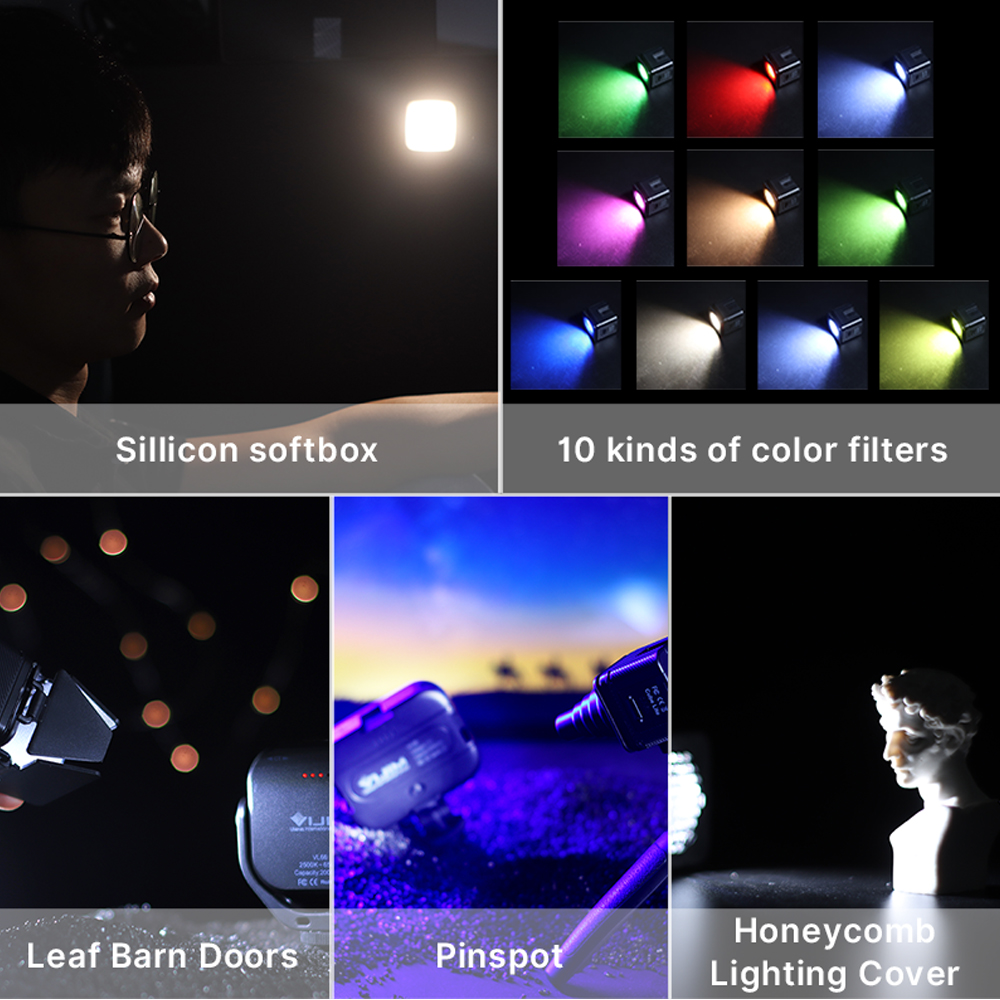 2. Com temperatura de cor fixa de 5500K e quatro níveis de intensidade ajustáveis, proporciona luz nítida e equilibrada para diferentes cenários. Inclui filtros magnéticos para alteração de cor e criação de efeitos, além de difusor de silicone para suavização da iluminação.