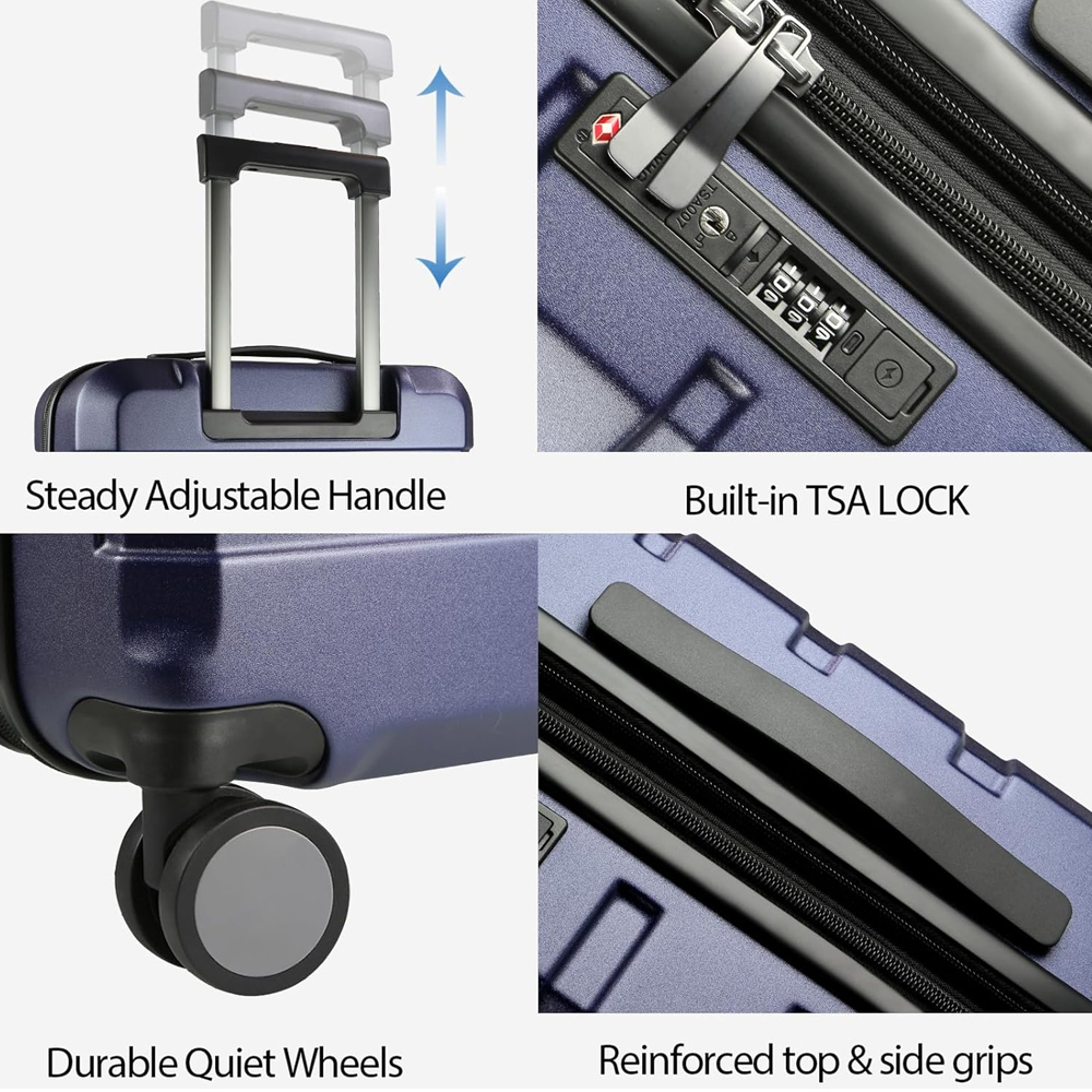 3. As rodas giratórias possuem eixo central de precisão e revestimento reforçado, garantindo durabilidade e silêncio em diferentes superfícies, como carpetes ou paralelepípedos. O zíper resistente evita rompimentos e a trava de combinação TSA garante segurança adicional. Alça telescópica ergonômica ajustável oferece conforto ao puxar a mala.