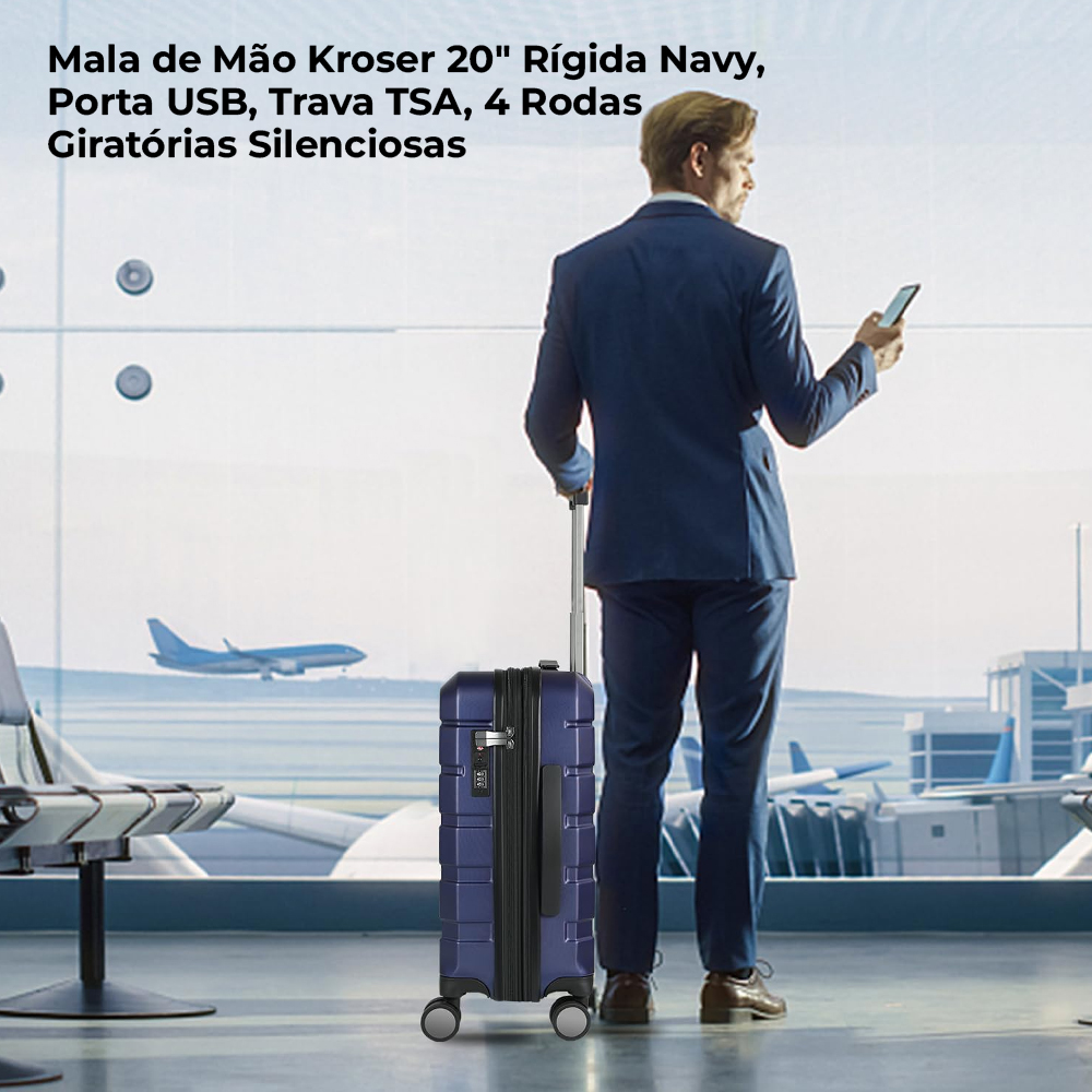 Mala de Mão Kroser 20″ Rígida Navy, Porta USB, Trava TSA, 4 Rodas Giratórias Silenciosas, Estrutura Rígida 100% PC, Compartimentos Internos Organizadores Ideal para Viagens