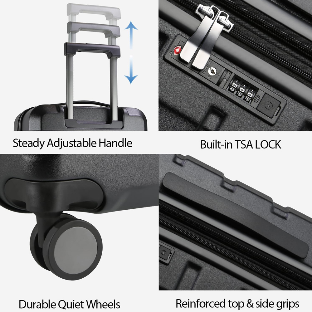 3. As rodas giratórias possuem eixo central de precisão e revestimento reforçado, garantindo durabilidade e silêncio em diferentes superfícies, como carpetes ou paralelepípedos. O zíper resistente evita rompimentos e a trava de combinação TSA garante segurança adicional. Alça telescópica ergonômica ajustável oferece conforto ao puxar a mala.