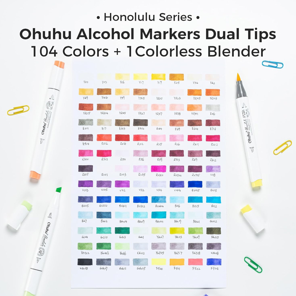 Ohuhu Honolulu Kit 104+1 Marcadores Artísticos Álcool Ponta Dupla Pincel & Cinzel para Desenho, Ilustração e Manga – Cores Vibrantes de Alta Pigmentação para Artistas, Estudantes e Hobbystas