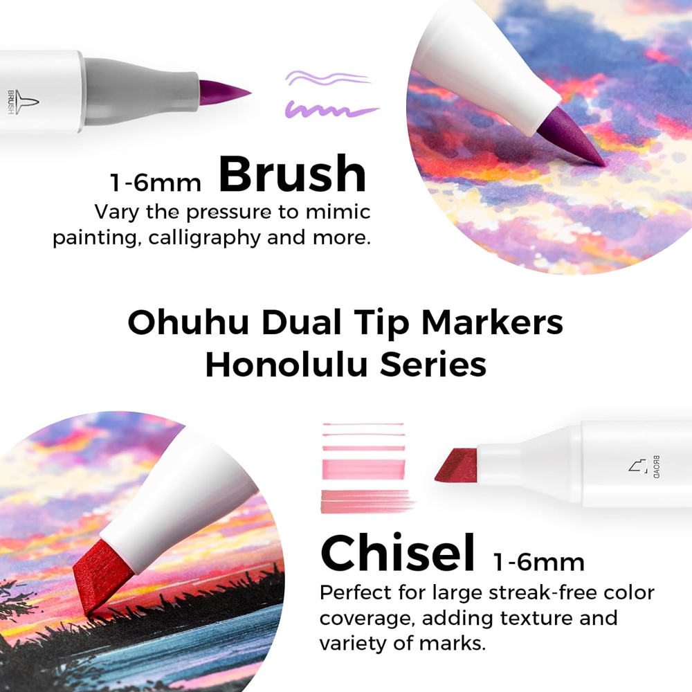 2. Cada marcador Ohuhu possui pontas duplas: uma ponta pincel flexível para traços fluidos, lettering e detalhes finos, e uma ponta cinzel larga para preenchimentos rápidos e linhas nítidas, oferecendo máxima versatilidade em seus projetos de ilustração.