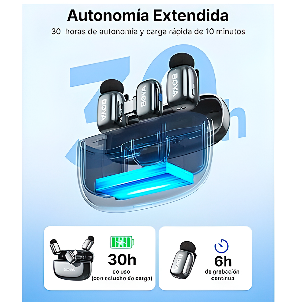 4. Autonomia Energética e Estojo Portátil: O conjunto oferece uma experiência de gravação ininterrupta com até 6 horas de uso contínuo por carga em cada microfone. Utilizando o prático estojo de carregamento incluso, a autonomia total se estende para até 30 horas, permitindo longas sessões de criação sem a preocupação com baterias descarregadas.